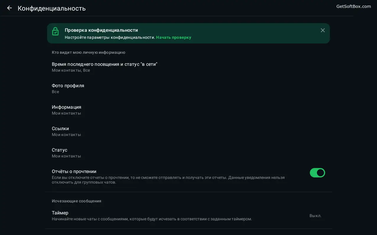 - Гибкие настройки приватности: Исчезающие сообщения, защита чатов паролем или отпечатком пальца, а также скрытие статуса «В сети» от определенных контактов.
